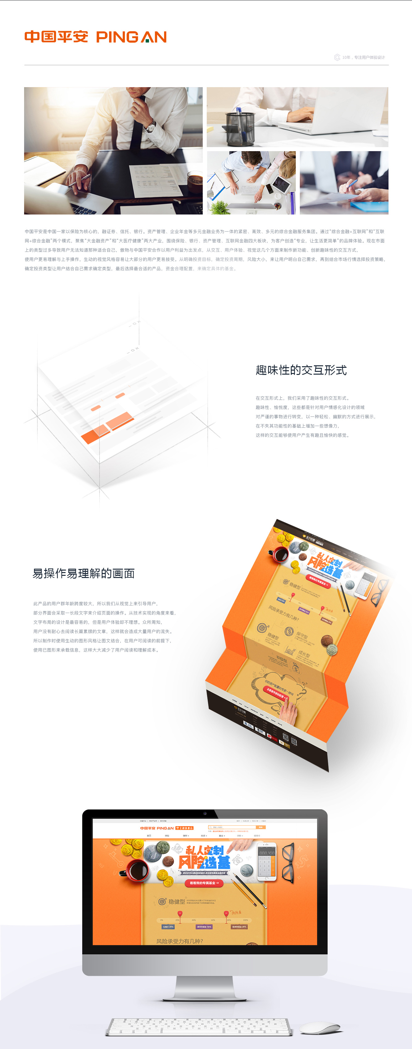 中国平安是中国一家以保险为核心的,金融证券、信托、银行、资产管理、 企业年金等多元金融业务为一体的紧密、高效、多元的综合金融服务集团。 凯赟与中国平安合作以用用户利益为出发点,制作新功能、创新趣味性的 交互方式,使用户更易理解、操作、接受,让用户明确自己的需求,选择 最适合自己产品。