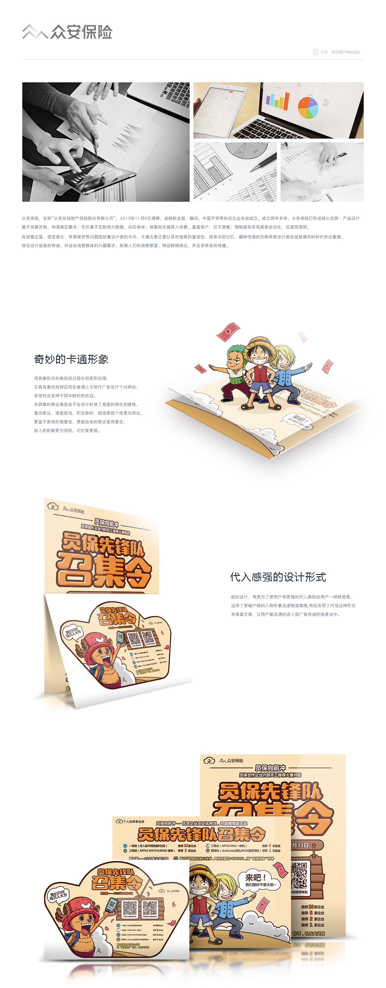 众安保险,2013年11月6日揭牌,由蚂蚁金服、腾讯、中国平安等知名企业 发起成立。我们以卡通元素设计,保证设计信息的传递,并迎合消费群体的 兴趣需求,刺激人们消费欲望,特征鲜明突出,并且非常容易和传播。
